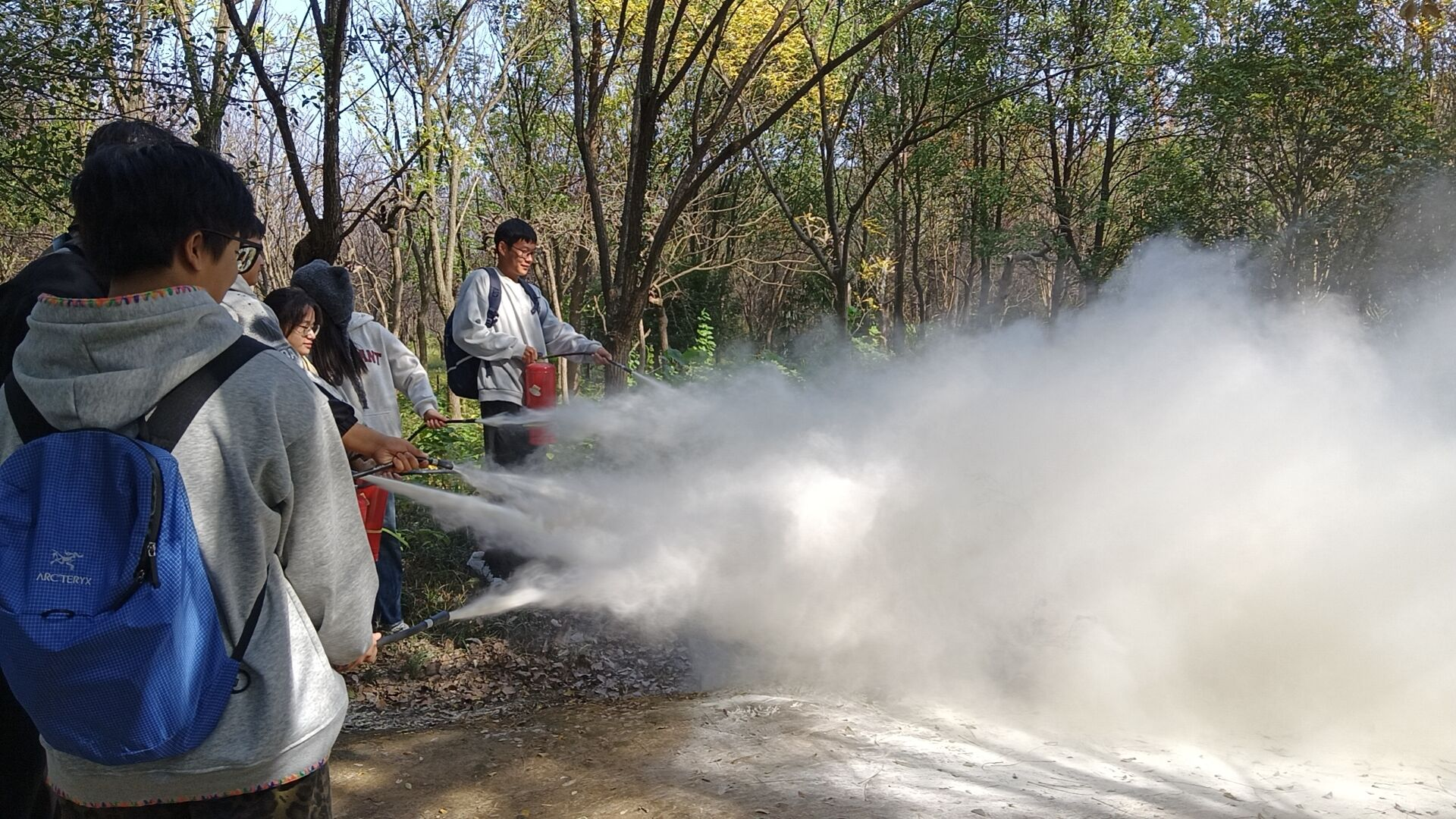 理论讲解结束后,现场模拟浓烟环境开展疏散逃生演练。师生沿安全通道快速撤离,全员安全到达指定集合点。在灭火实操环节,张老师演示了灭火器“提、拔、握、压”操作要领,指导师生分组实操演练。