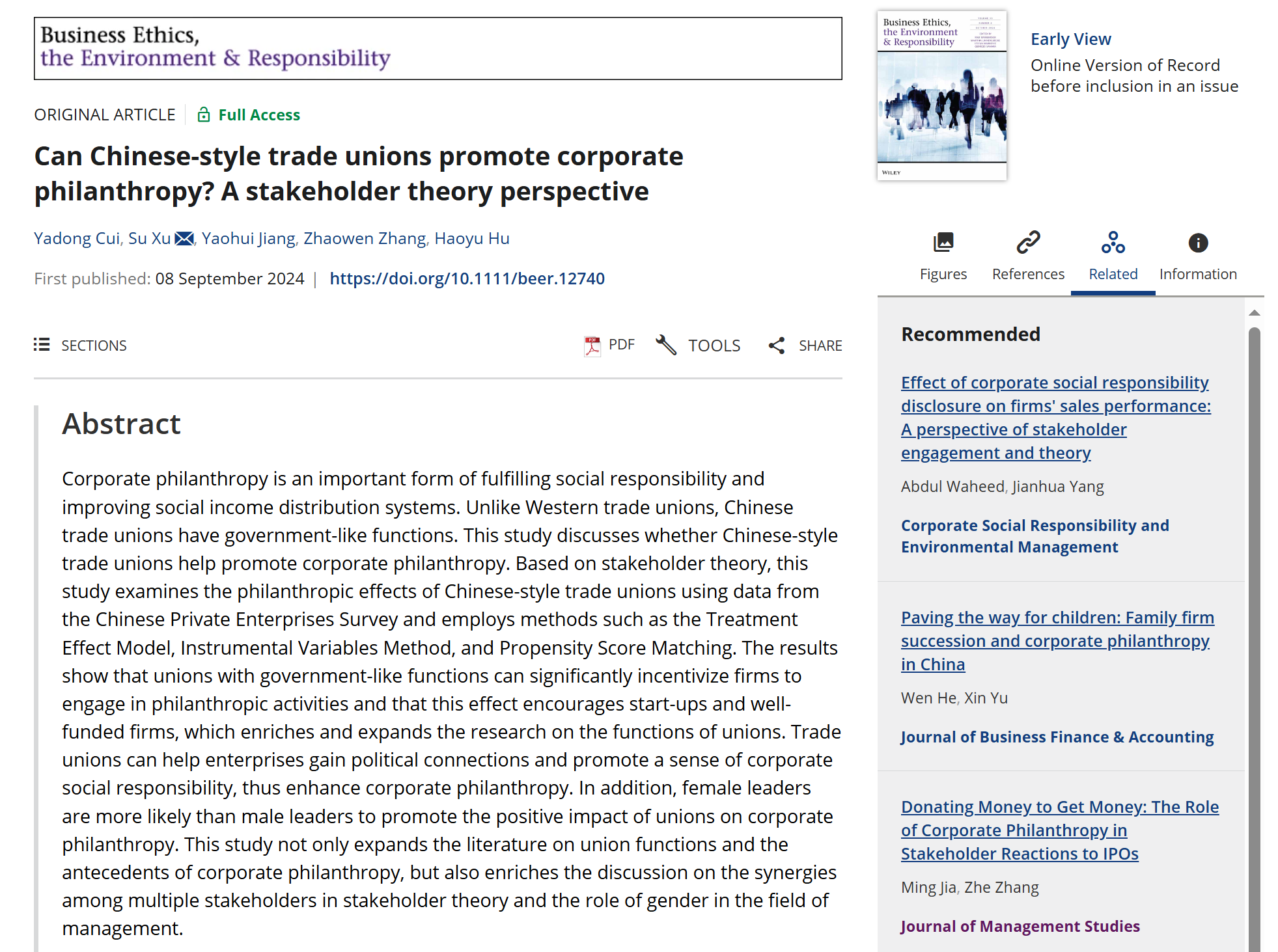 近期,电子商务教研室徐苏博士以通讯作者身份,在SSCI期刊《Business Ethics, the Environment & Responsibility》发表了题为《Can Chinese-style trade unions promote corporate philanthropy? A stakeholder theory perspective》的学术论文。该刊由Wiley国际出版社出版,聚焦企业道德与伦理及企业社会责任问题,2023年综合影响因子为3.6,属于中科院分区哲学大类二区刊物。