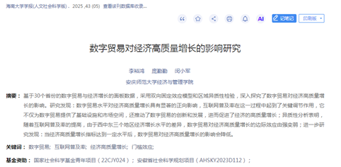 李裕鸿副教授以第一作者身份撰写的论文《数字贸易对经济高质量增长的影响研究》刊发于《海南大学学报 (人文社会科学版)》第五期。文章围绕数字贸易与经济高质量增长的关系,借助 30 个省份的面板数据,通过双向固定效应模型和区域异质性检验等方法,深入探究了数字贸易对经济高质量增长的影响及相关作用机制。
