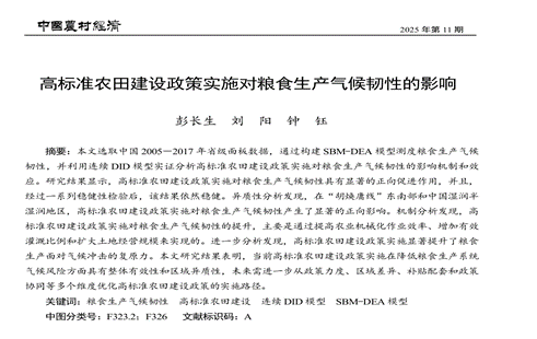 彭长生教授、2023级统计学研究生刘阳和中国农科院农经所钟钰研究员,在国内农村经济研究领域顶尖期刊《中国农村经济》2025年第11期发表学术论文《高标准农田建设政策实施对粮食生产气候韧性的影响》,这是彭长生教授第二次在该期刊发表论文,也是2018年经管学院与中国农科院农经所签订战略合作协议,开展中国粮食发展问题合作研究的最新成果。
