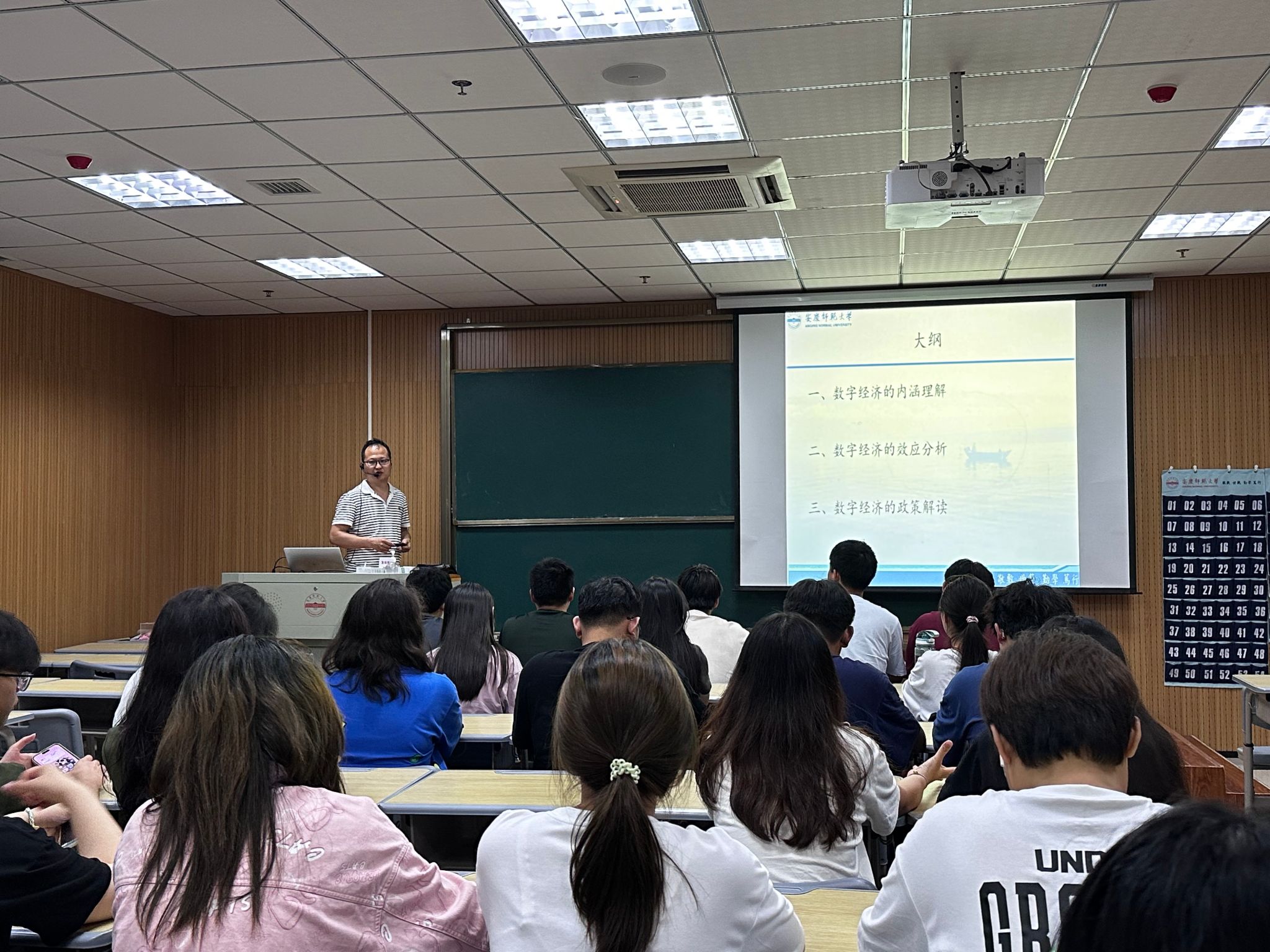 丁玉龙副教授通过互动交流,引导同学们对身边的数字经济问题开展思考。他详细介绍了数字经济的本源与内涵,并结合现实案例,探讨了数字经济在产业升级、就业结构、居民收入等方面产生的各种效应。丁玉龙副教授在讲座中,解读了国家和安徽省关于支持数字经济发展的有关政策,引导学生关注数字产业化和产业数字化发展态势,勉励从中寻找政策效应研究切入点,并尝试围绕数字经济的具体应用谋划创新创业思路。