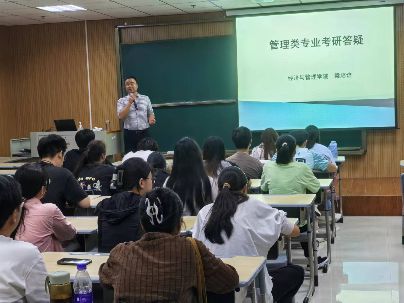 本次答疑活动分为三个环节。首先,梁院长为同学们解读了2024年考研总体形势,从考研原因、报考学校、专业选择、考研录取与调剂等方面作了详细讲解,建议同学们多关注考研相关信息、了解报考学校招录取规则、保持良好心态等。其次,学院2024级国际商务专业在读研究生谭开欣同学分享了成功考研经验,鼓励同学们在备考期间专注复习、集中精力,做好复习和身心健康的平衡。最后,参加此次活动同学就自身所关心的问题进行了互动交流。
