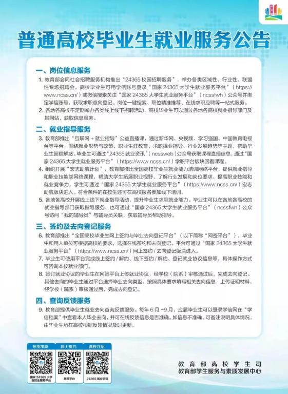 日前,教育部办公厅印发《教育部办公厅关于开展2022年高校毕业生就业创业政策宣传月活动的通知》(教学厅函〔2022〕7 号),于2022年4月组织开展高校毕业生就业创业政策宣传月活动,编发系列政策公告,帮助更多高校毕业生知晓各项促就业政策,促进高校毕业生更加充分更高质量就业。下面让我们一起来看教育部印发的“普通高校毕业生就业创业政策公告”吧~