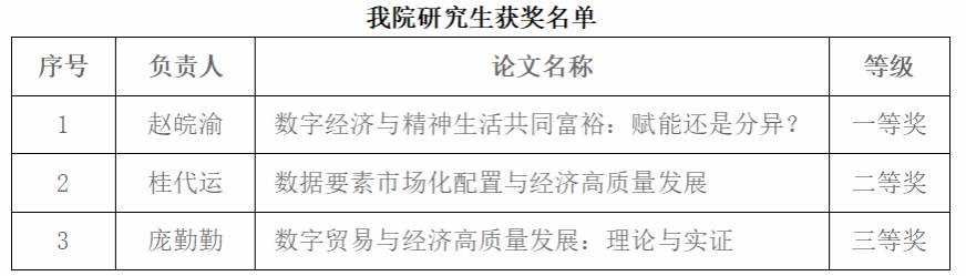 研究生在此次大赛(研究生组)中获得一等奖、二等奖、三等奖各1项,其中由余卫博士指导,23级国际商务赵皖渝、张森茹和傅雅萍三位同学共同完成的论文《数字经济与精神生活共同富裕:赋能还是分异?》获得现场赛参赛资格,经过现场答辩荣获一等奖。