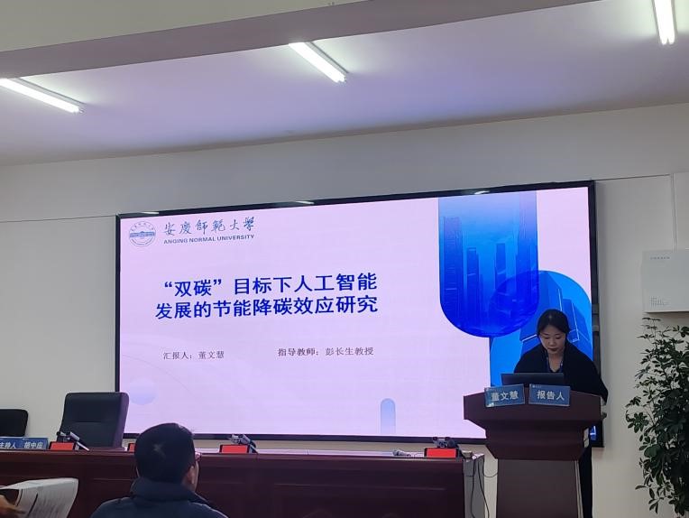 在数字经济与人工智能分论坛中,董文慧作了题为《“双碳”目标下人工智能发展的节能降碳效应研究》的学术报告。该论文由董文慧与其指导教师彭长生教授合作完成。研究立足全球气候变化加剧与我国“双碳”战略深入实施的背景,系统探讨了人工智能技术在提升能源效率、加强碳排放管控等领域的应用潜力。通过实证分析,论文验证了人工智能对促进节能降碳效率的显著作用,深入剖析了技术赋能“双碳”目标实现的内在机制与实践路径,并提出了具有针对性及可操作性的政策建议。报告结束后,与会教师对论文的研究价值和规范性给予充分肯定,并就进一步完善研究提出了指导意见。