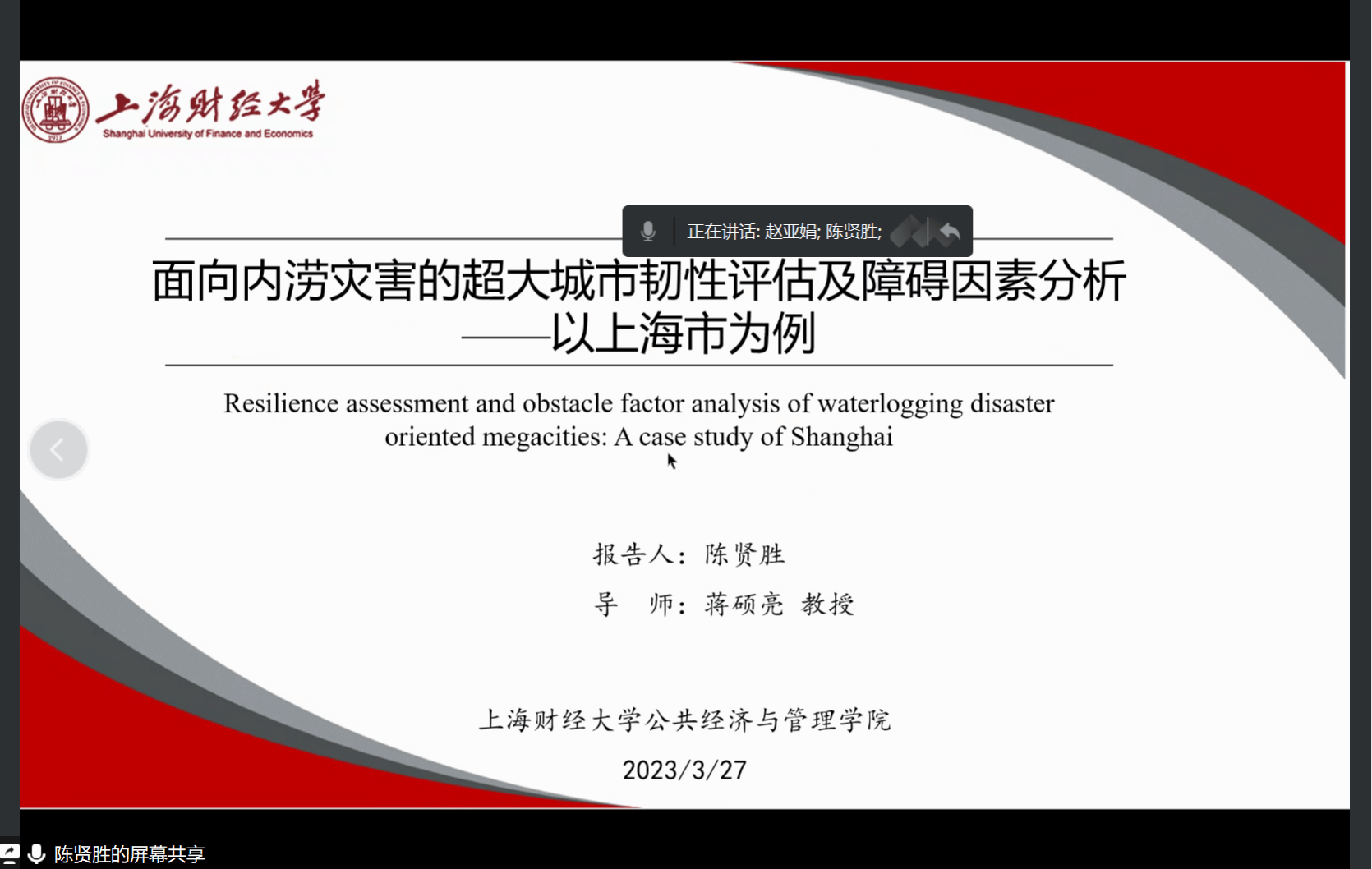 报告人简介:陈贤胜,上海财经大学经济统计学博士研究生,主要研究领域为政府治理、城市治理。参与国家自然基金重大项目、国家社科基金重大项目等多项,在《Natural Hazards》《Environment Science and Pollution Research》《统计与决策》等国内外期刊发表或录用论文多篇。