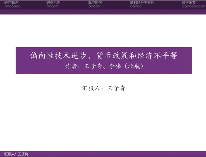 在本次分享中,王子奇博士在社会经济发展不均衡以及技术进步存在偏向性的理论背景下,采用包含家庭异质性的动态随机一般均衡模型(TANK-DSGE),分析探讨技能偏向性技术进步与资本偏向性技术进步对经济不平等的影响。研究发现,技能偏向性技术进步同时加剧了收入不平等和消费不平等,资本偏向性技术进步在促进总产出的同时扩大了收入不平等,但是缓解了消费不平等;其次,技术学习成本、货币政策 和金融可得性等因素,是技术进步影响经济不平等的重要途径。最后,经济不平等能够显著影响居民福利水平,而合理的货币政策规则能够通过缓解不平等程度减少偏向性技术进步的负面影响,有利于整体福利水平的改进。