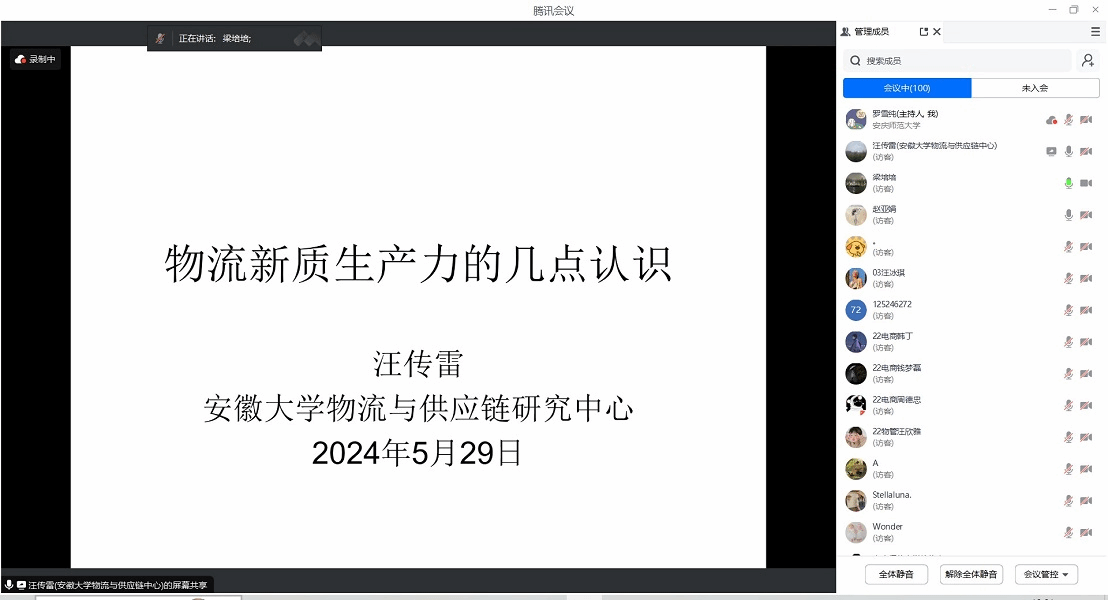 邀请,通过线上方式分享了题为“物流新质生产力的几点认识”的学术报告。学院教师、研究生及物流管理专业本科生共90余人参加了交流活动,报告会由梁培培副教授主持。