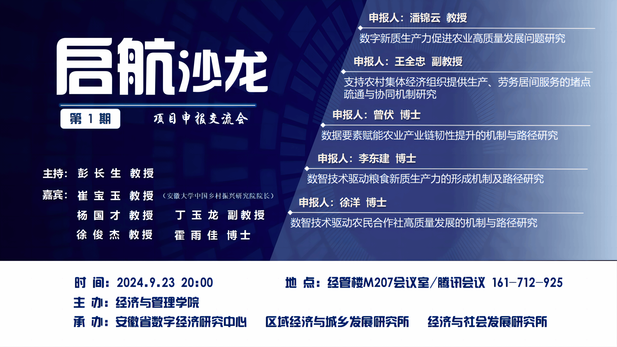 策划创建的品牌活动“启航沙龙”顺利举办。首期沙龙由安徽省数字经济研究中心、区域经济与城乡发展研究所、经济与社会发展研究所联合承办,安徽大学中国乡村振兴研究院院长崔宝玉教授作为特邀嘉宾参与交流,沙龙由彭长生教授主持。
