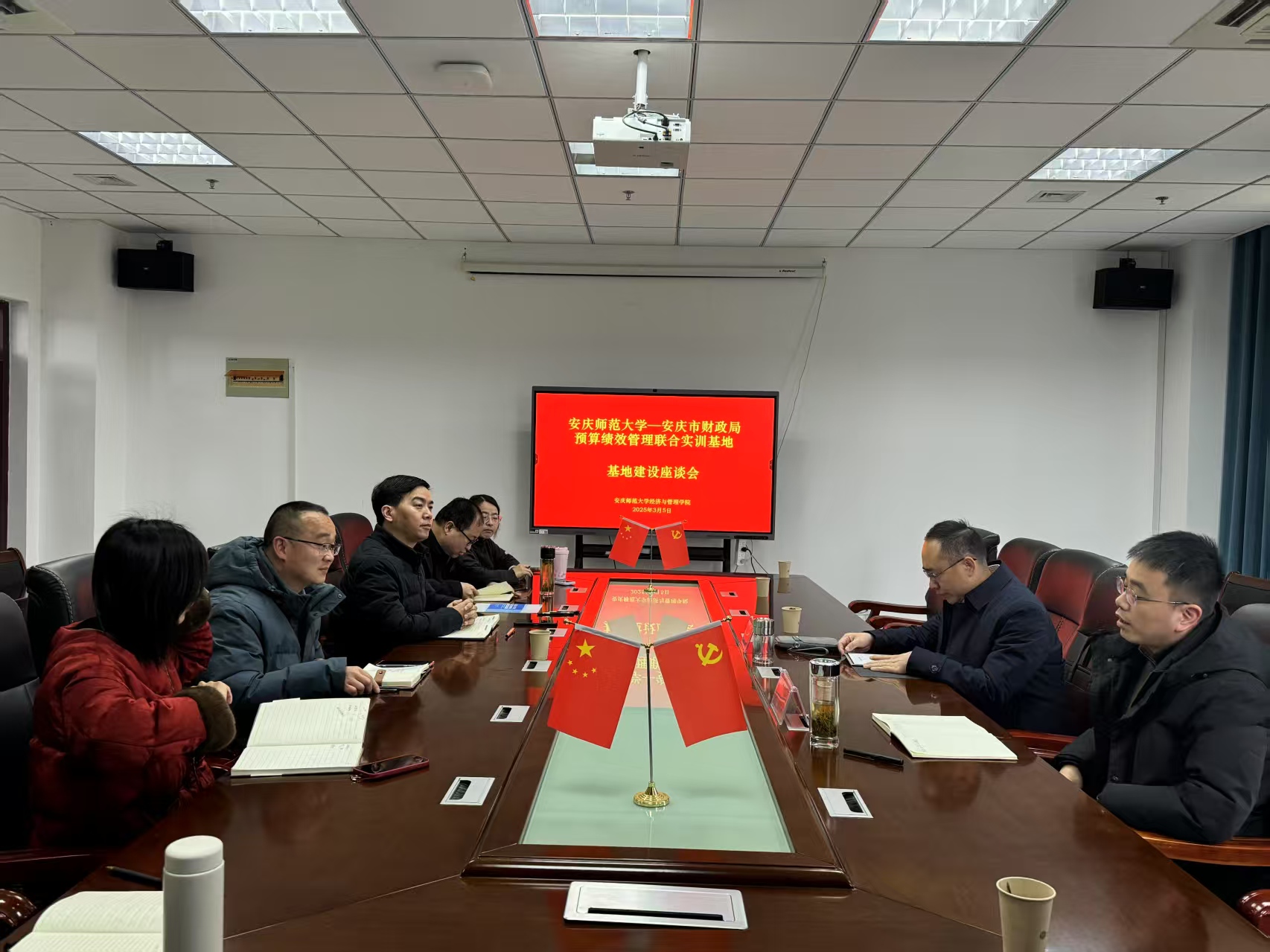 —安庆市财政局预算绩效管理联合实训基地建设座谈会,中央财经大学政府管理学院教授曹堂哲莅临指导,安庆市财政局预算编制办公室主任(预算绩效管理科)卢建军和基地部分骨干教师到场交流,会议由院长徐俊杰主持。